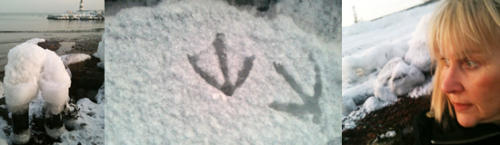 spuren der seevögel, die mit ihren füßen kleine anker in das eis drucken….